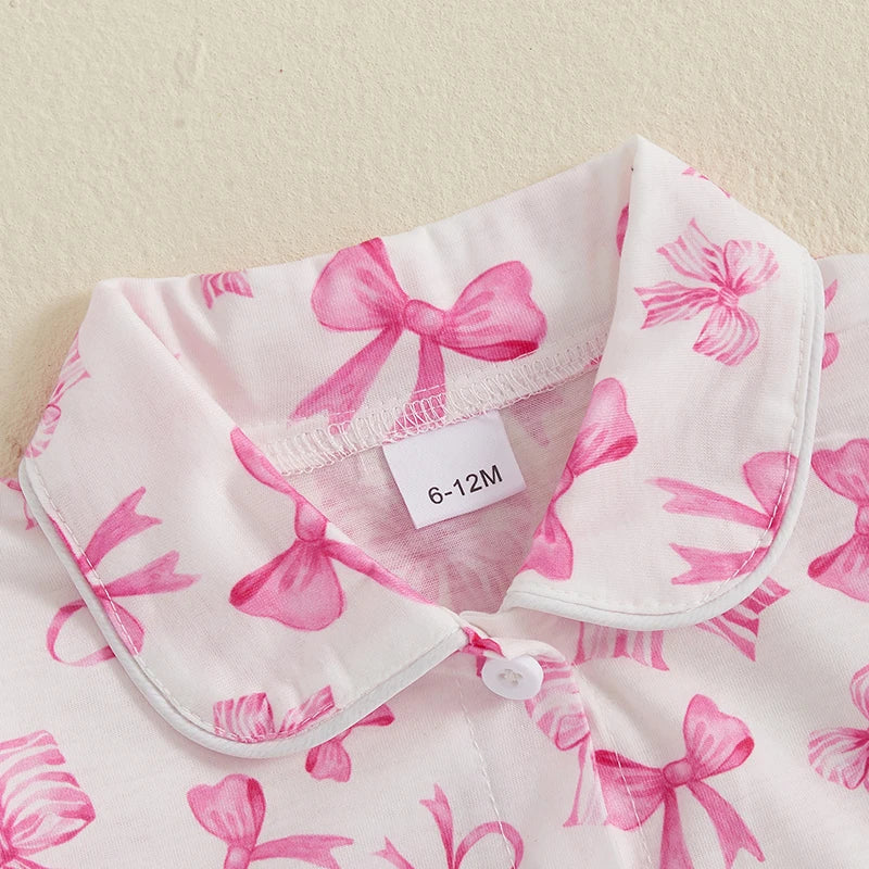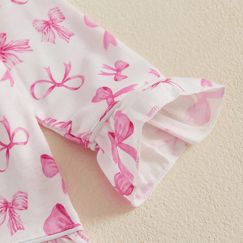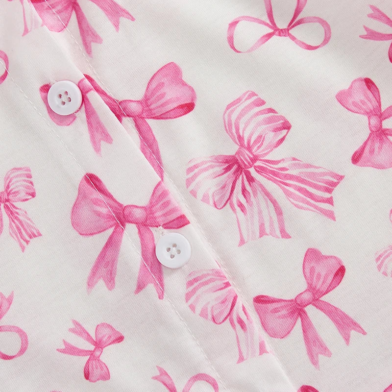 - Includes a long-sleeve bow-print ruffle shirt and coordinating pants in a crisp white color, making it easy to mix and match with other outfits.