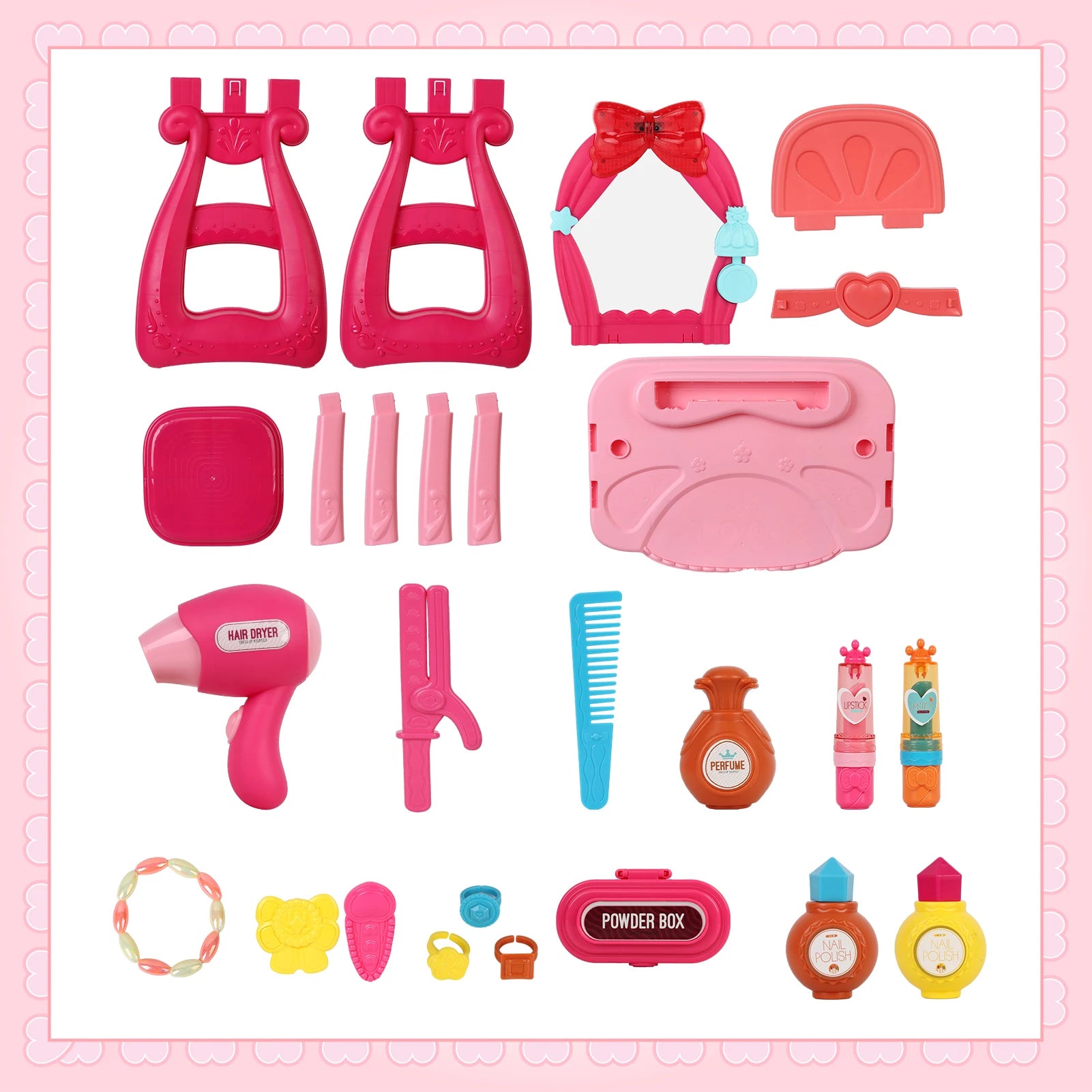 - 2-in-1 vanity with pretend makeup including a mirror, brushes, clips, hair ties, stickers, and a sturdy chair for comfortable, mess-free dress-up play.