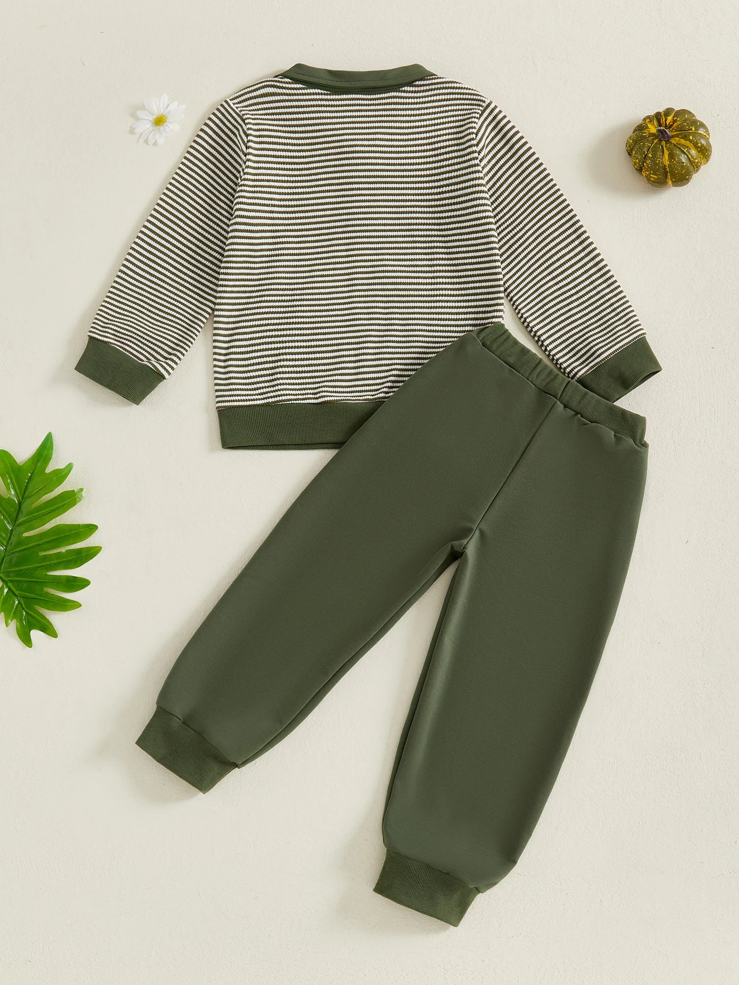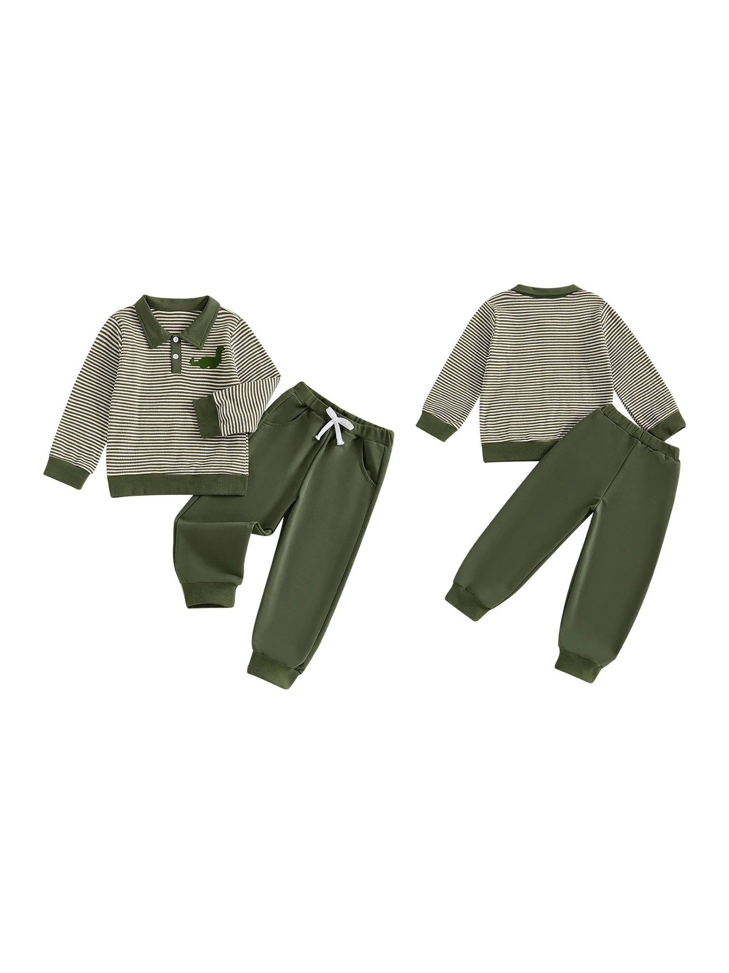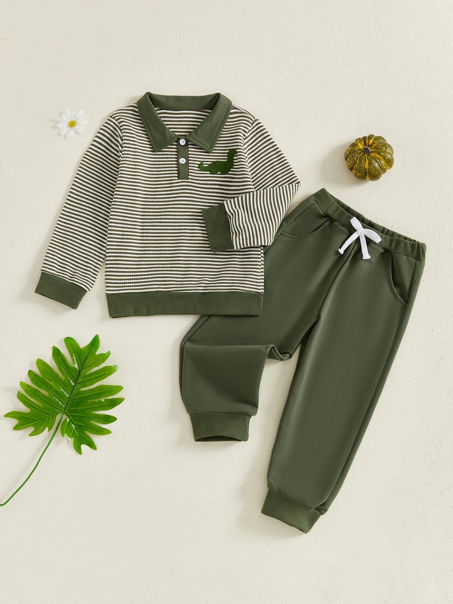 - Dinosaur embroidery and stripe print on army green fabric add playful, casual style for everyday adventures your child will love.