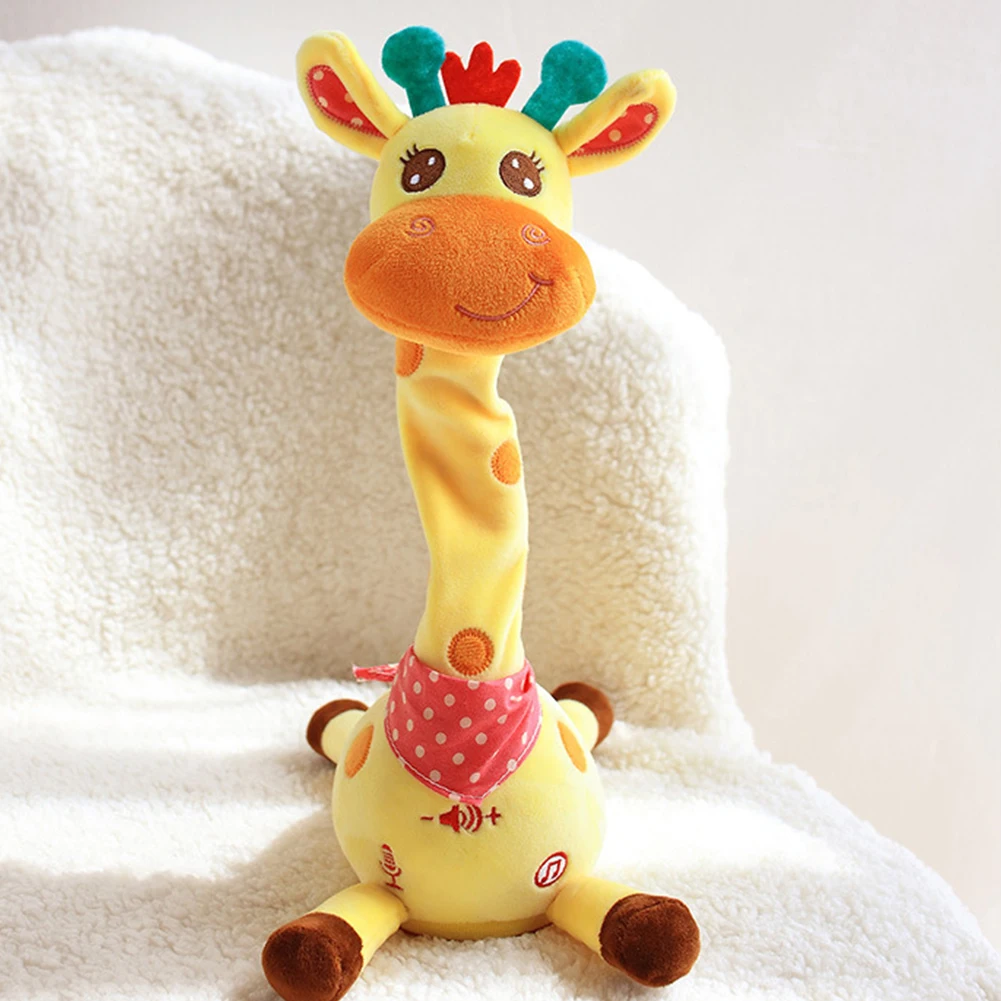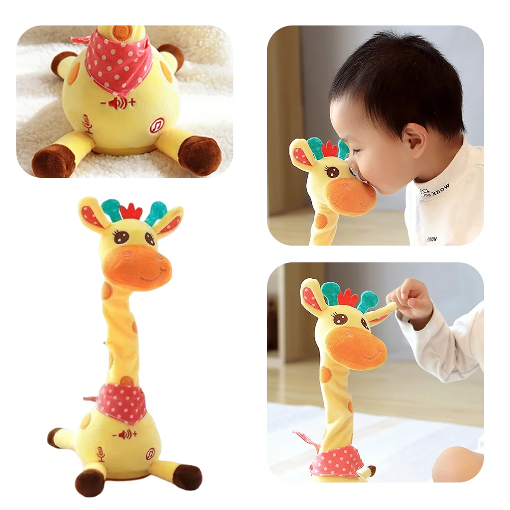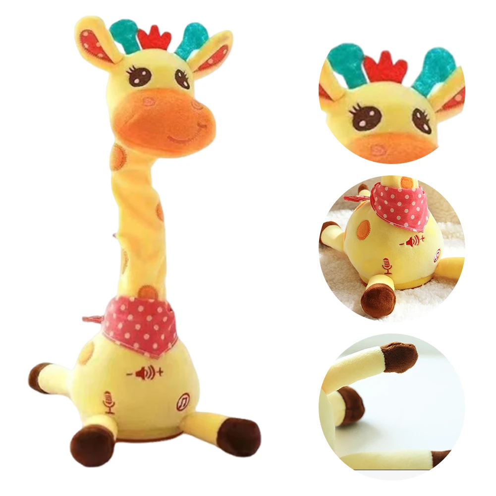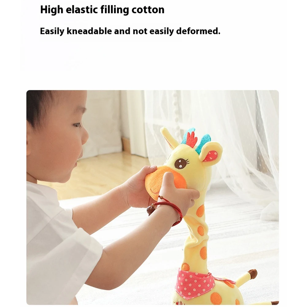 | Soft Giraffe Stuffed Toys Repeat What You Say Lovely Swinging Plush Giraffe Light Up Giraffe Toy for 6 To 12 Months Baby Features: 1.Adjustable Volume Giraffe: Our soft giraffe stuffed toys come with an upgraded music feature allowing you to adjust the volume levels as needed. This gives you full control over the sound environment, enhancing your child's playtime experience. 2.Talking Dancing Giraffe: Delight your little ones with our lovely swinging plush giraffe. It captivates with its charming design and features the same dancing animal baby toy functions as a popular dancing cactus, including singing and LED lights. 3.Plush Giraffe Companion: Made from high-quality short plush, our cute singing giraffe doll includes embroidered eyes, mouth, and buttons, ensuring a soft and comfortable feel. Easily portable, it's for picnics, travel, parties, or indoor dining tables. 4.Interactive Baby Giraffe: The interactive light up giraffe toy offers fun voice mimicry features, encouraging kids to sing and speak while developing their sense of rhythm. Long press the button to record special messages, making it a delightful gift. 5.Voice Recording Giraffe Toy: This adorable long-necked friend can record messages of up to 15 seconds. Simply press the button to play back recordings, or delete them by holding the button until you hear the beep, ensuring endless entertainment. Specification: Origin: Mainland China Product Sized: 350.00 x 200.00 mm / 13.78 x 7.87 inches Main Material: Plush Note: 1 x Toy |